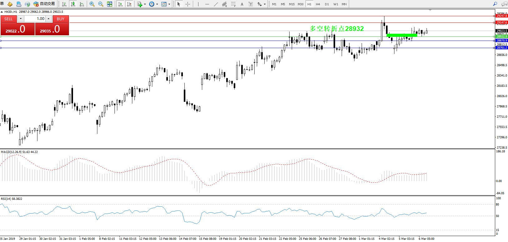 恒指HK50 ——1小时K线图显示: