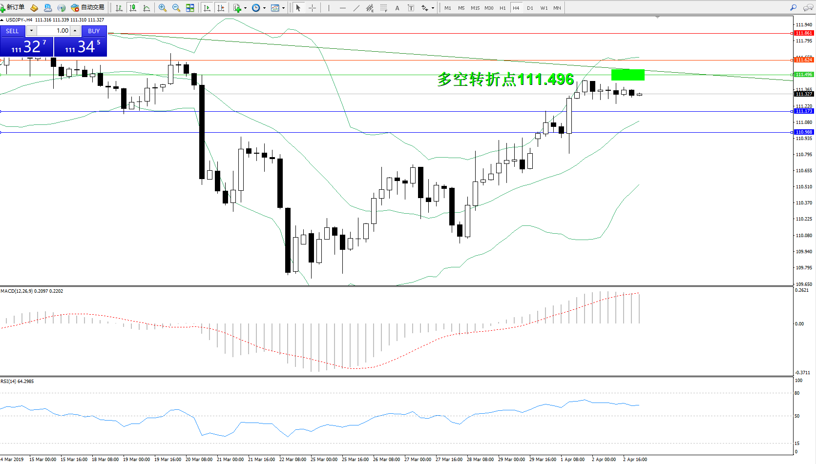 备选策略:111.496上方看涨,目标111.624、111.861