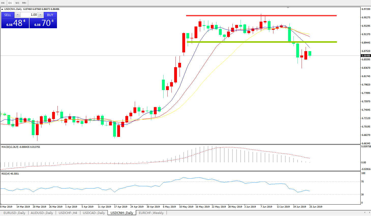 技术面简析:日线图呈有序空头排列,MACD逼近0轴且动能柱绿柱显现,RSI逐步走低,在贸易争端缓解及G20乐观预期推动下,汇价大概率将进一步走低。