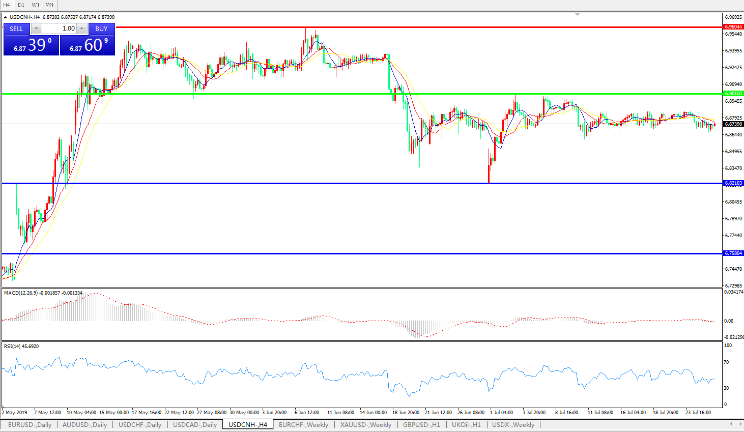 交易策略: 在6.9010之下,看跌,目标价位为6.8210,然后为6.7580。