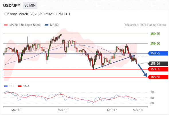 交易策略: 在 159.25 之下,看跌,目标价位为 158.85 ,然后为 158.65 。