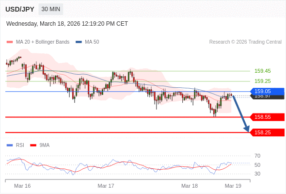 在 159.05 之下,看跌,目标价位为 158.55 ,然后为 158.25 。
