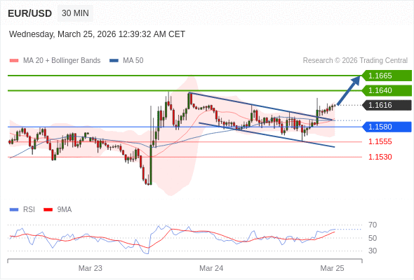 在 1.1580 之上,看涨,目标价位为 1.1640 ,然后为 1.1665 。
