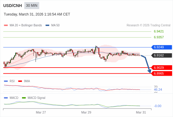 美元/人民币 当日内 : 看跌,在 6.9249 之下。