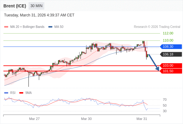 交易策略: 在 108.30 之下,看跌,目标价位为 103.00 ,然后为 101.50 。