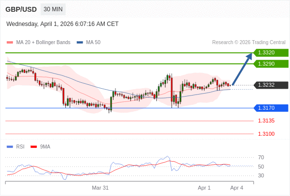 在 1.3170 之上,看涨,目标价位为 1.3290 ,然后为 1.3320 。