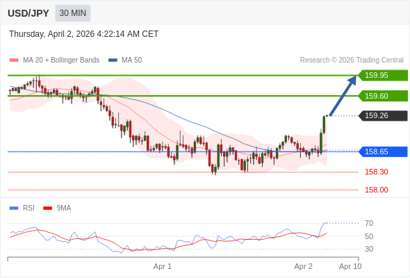 在 158.65 之上,看涨,目标价位为 159.60 ,然后为 159.95 。