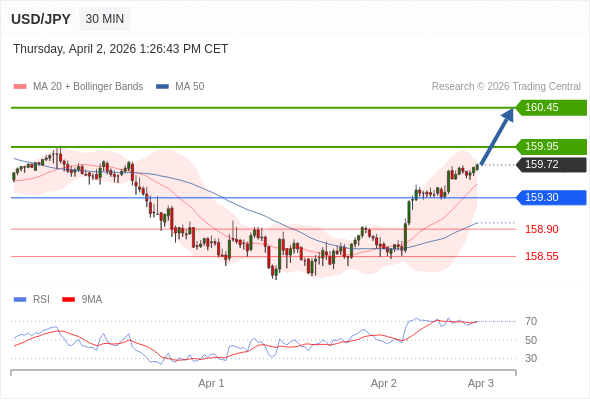 在 159.30 之上,看涨,目标价位为 159.95 ,然后为 160.45 。