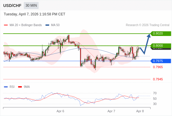 在 0.7975 之上,看涨,目标价位为 0.8000 ,然后为 0.8020 。