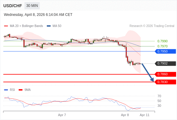 在 0.7950 之下,看跌,目标价位为 0.7860 ,然后为 0.7830 。