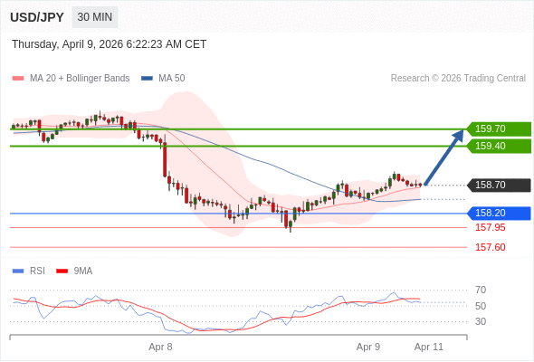 在 158.20 之上,看涨,目标价位为 159.40 ,然后为 159.70 。