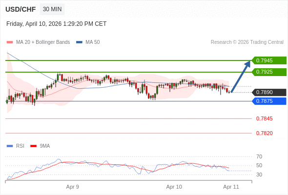 美元/瑞郎 当日内: 在0.7875之上,看涨。