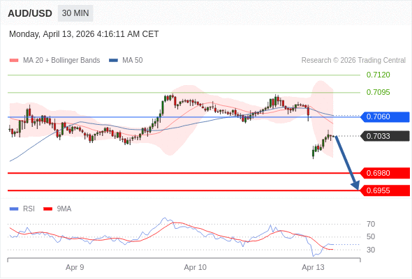 在 0.7060 之下,看跌,目标价位为 0.6980 ,然后为 0.6955 。