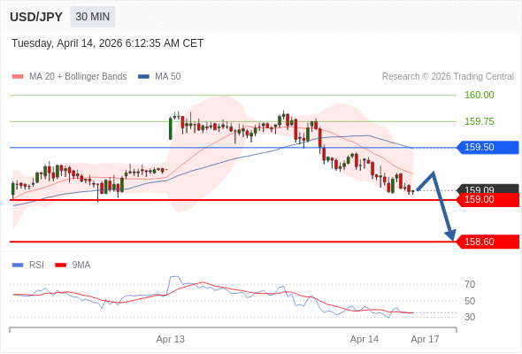 在 159.50 之下,看跌,目标价位为 159.00 ,然后为 158.60 。