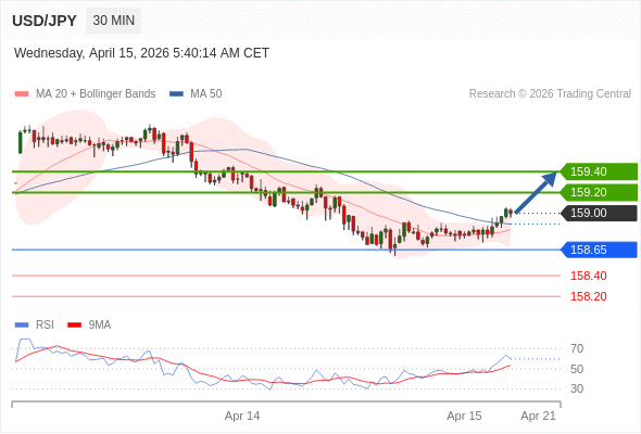在 158.65 之上,看涨,目标价位为 159.20 ,然后为 159.40 。