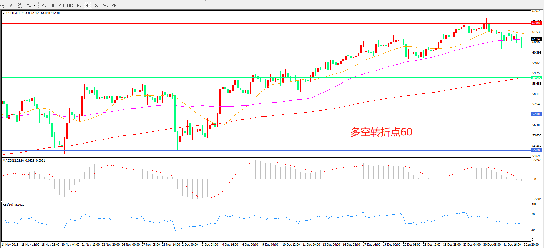 4小时图看,油价呈现高位震荡,62美元一线成为短期阻力,55周期均线成为短期支撑,MACD红柱缩短,绿柱增加,RSI指标走平,日内震荡上行概率较大。