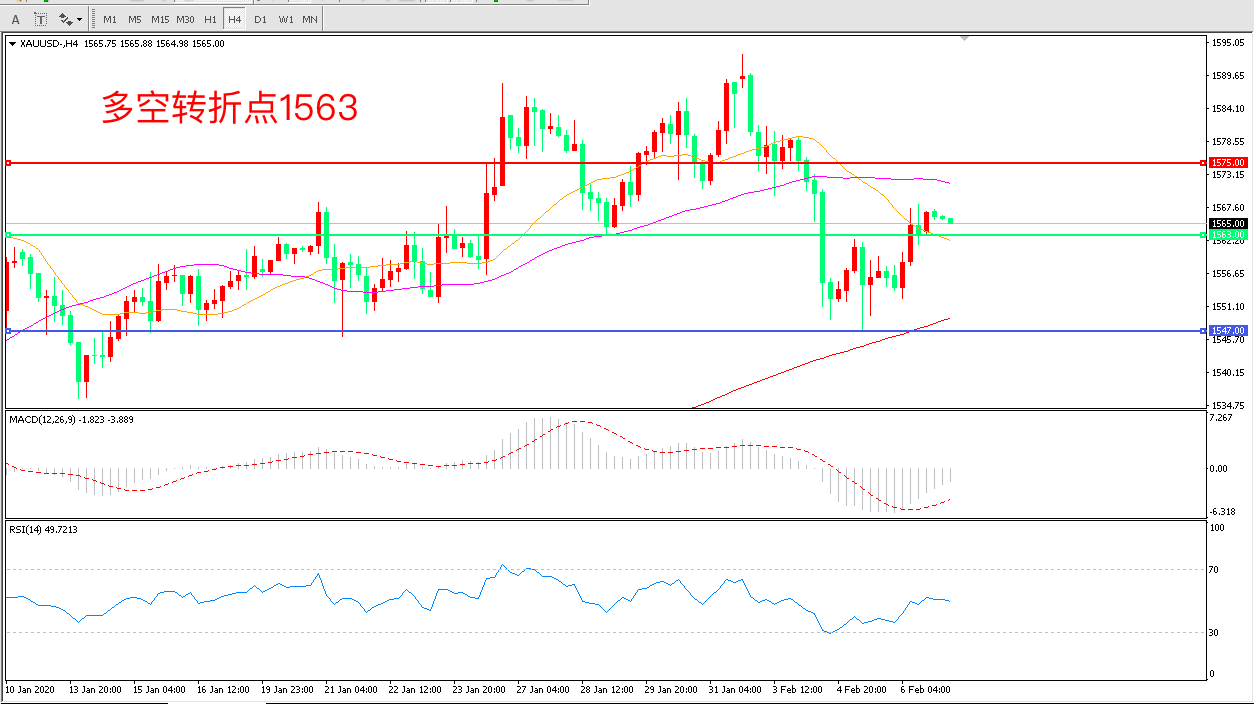 4小时图看,金价震荡反弹整体走势有所回暖,1563成为短期多空分水岭 MACD绿柱缩短RSI指标走平,日内延续震荡概率较大