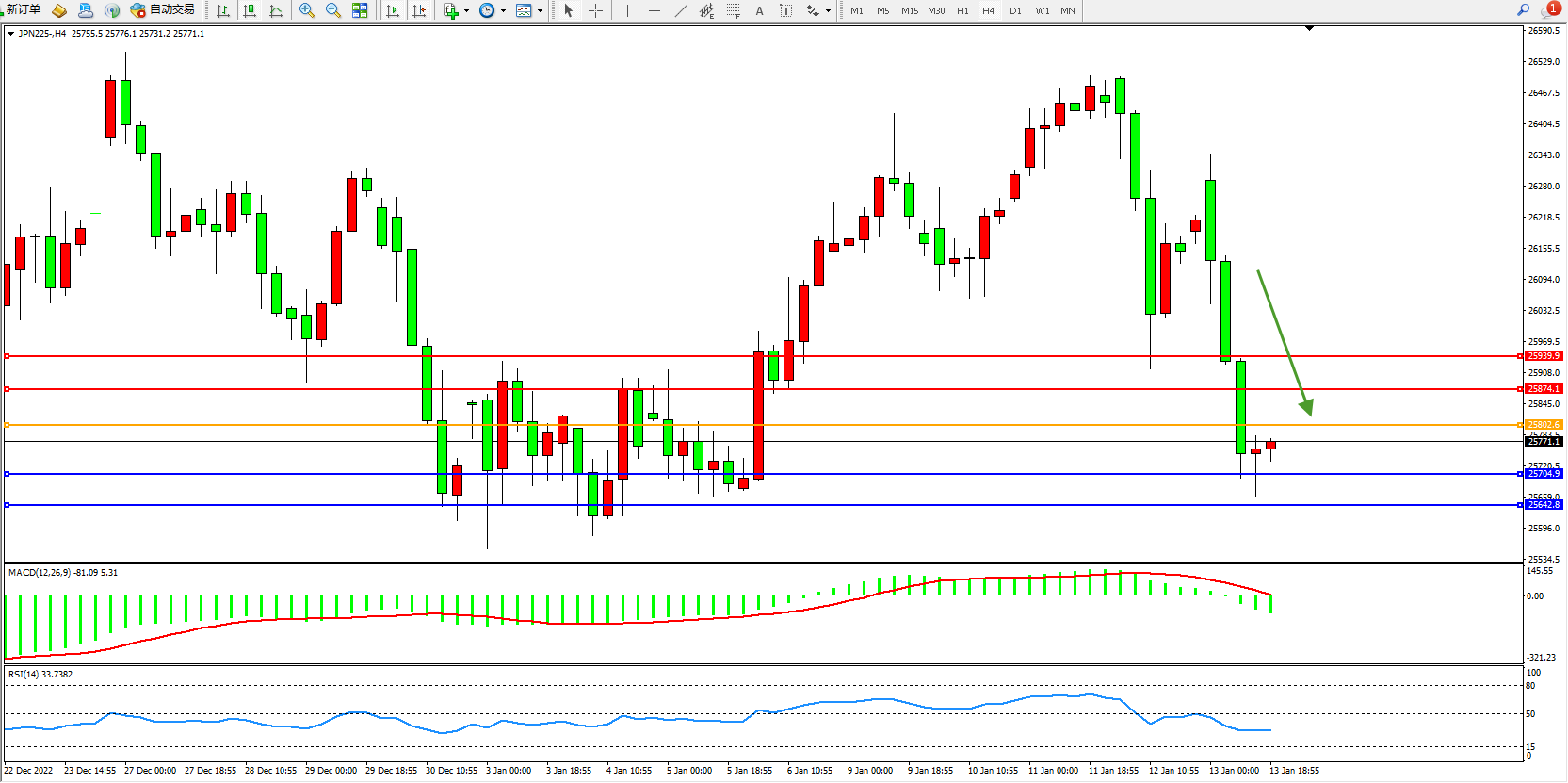 日经指数JPN225——4小时K线图显示: