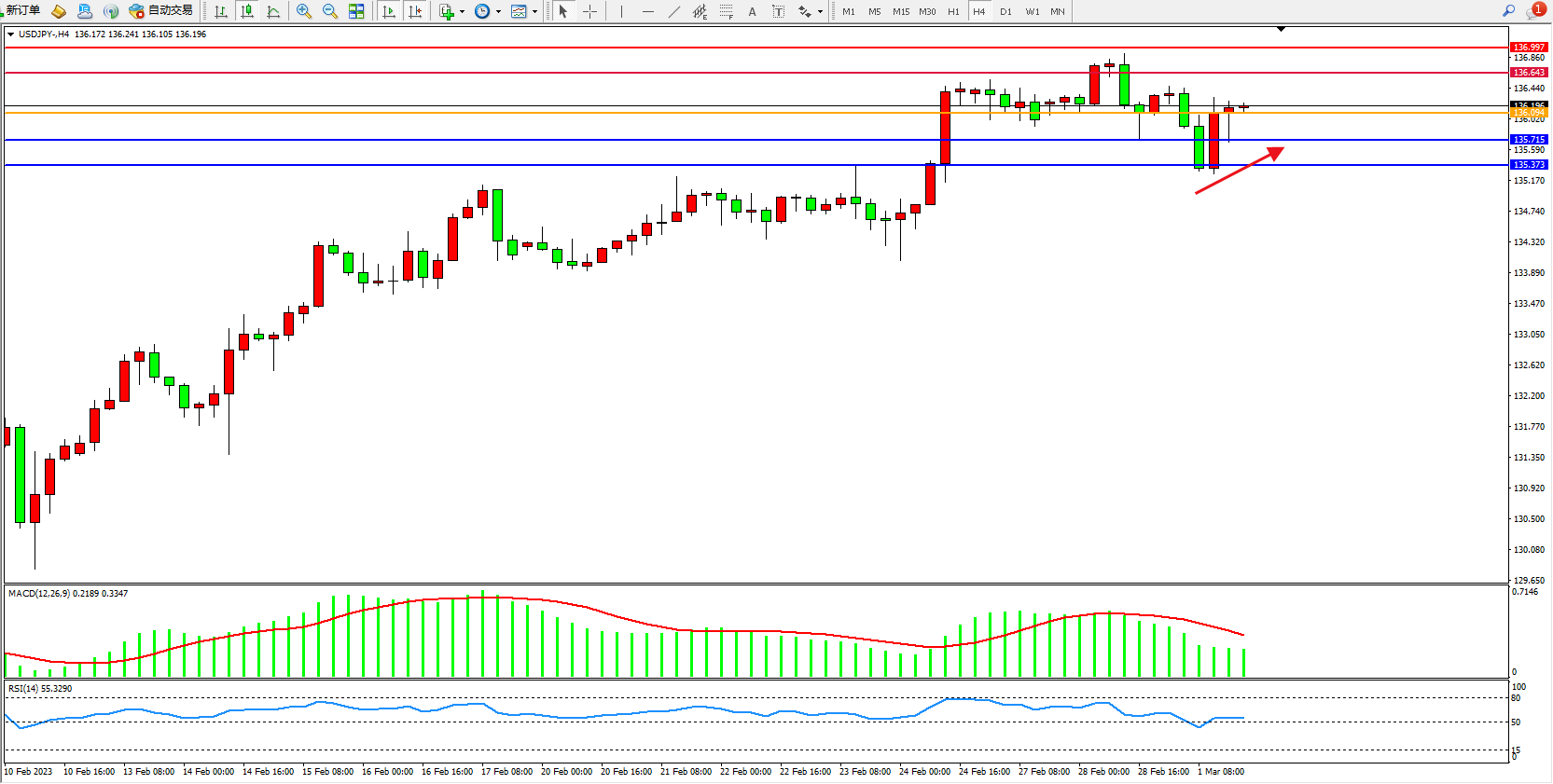 交易策略:136.094上方看涨,目标136.643、136.997