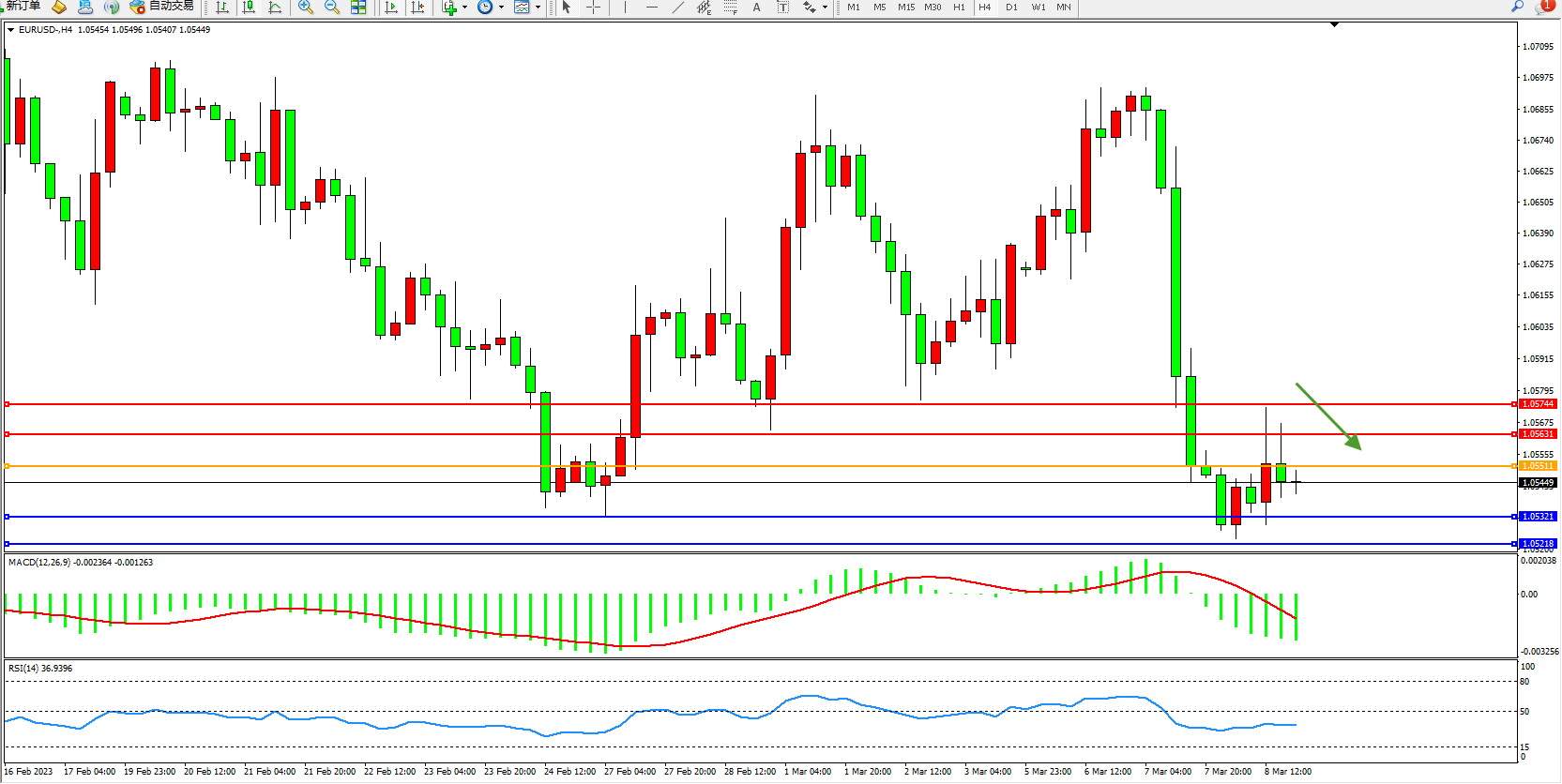 欧元美元EURUSD—4小时K线图显示: