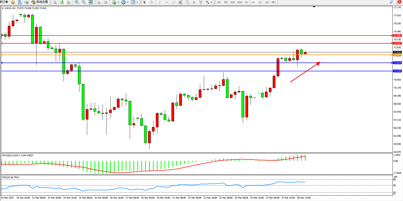 原油USOil——4小时K线图显示:
