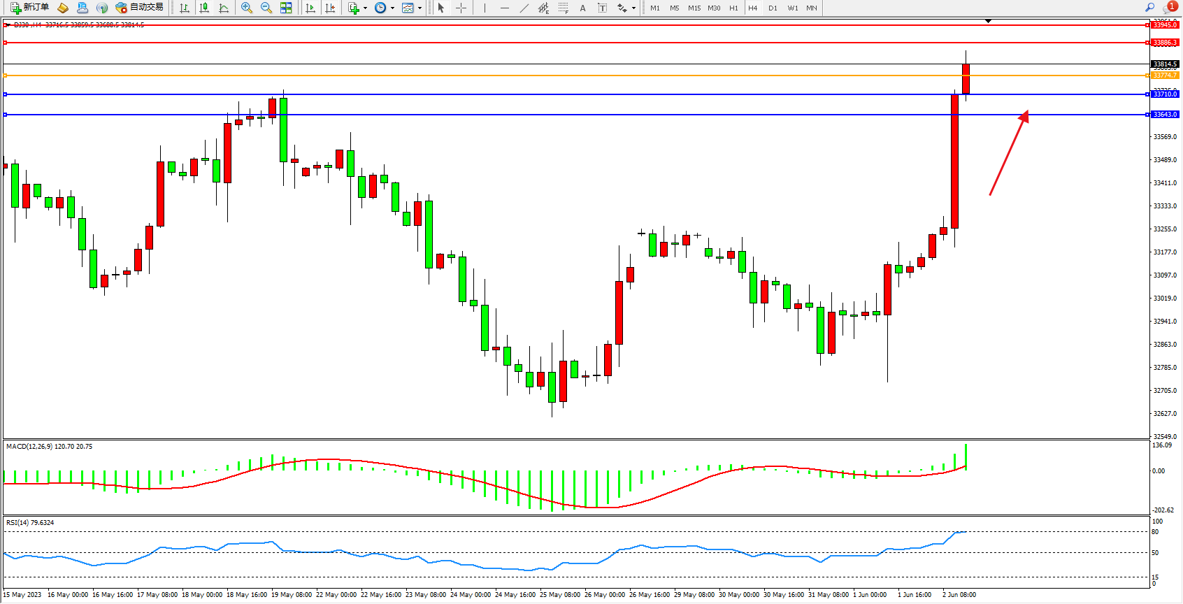 道琼斯指数DJ30——4小时K线图显示: