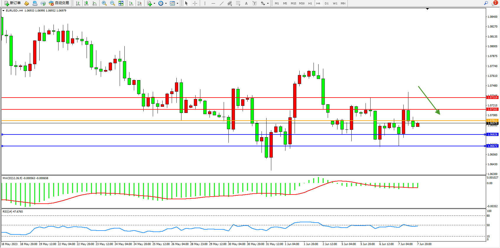 欧元美元EURUSD—4小时K线图显示: