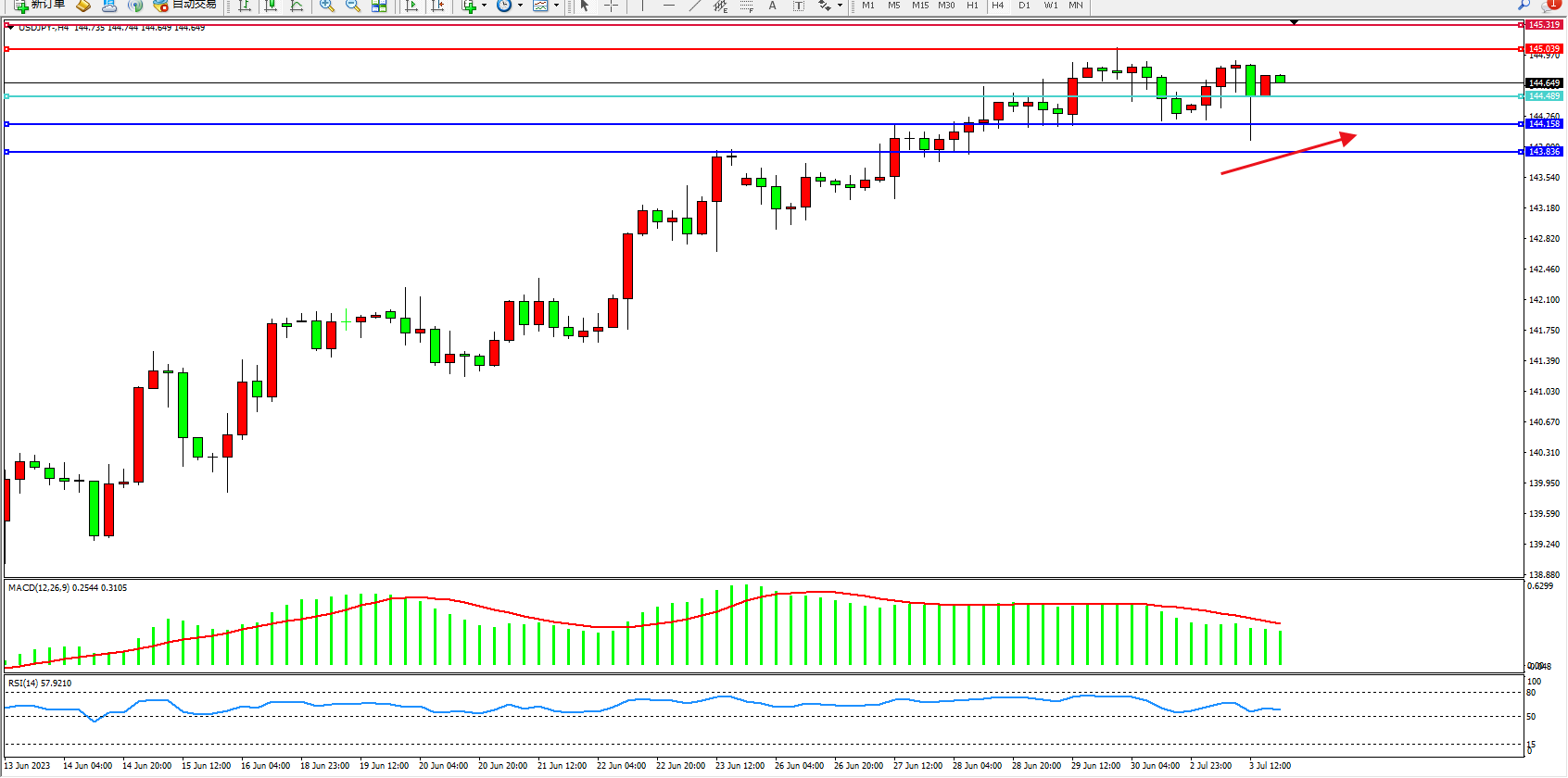 交易策略:144.489上方看涨,目标145.039 145.319