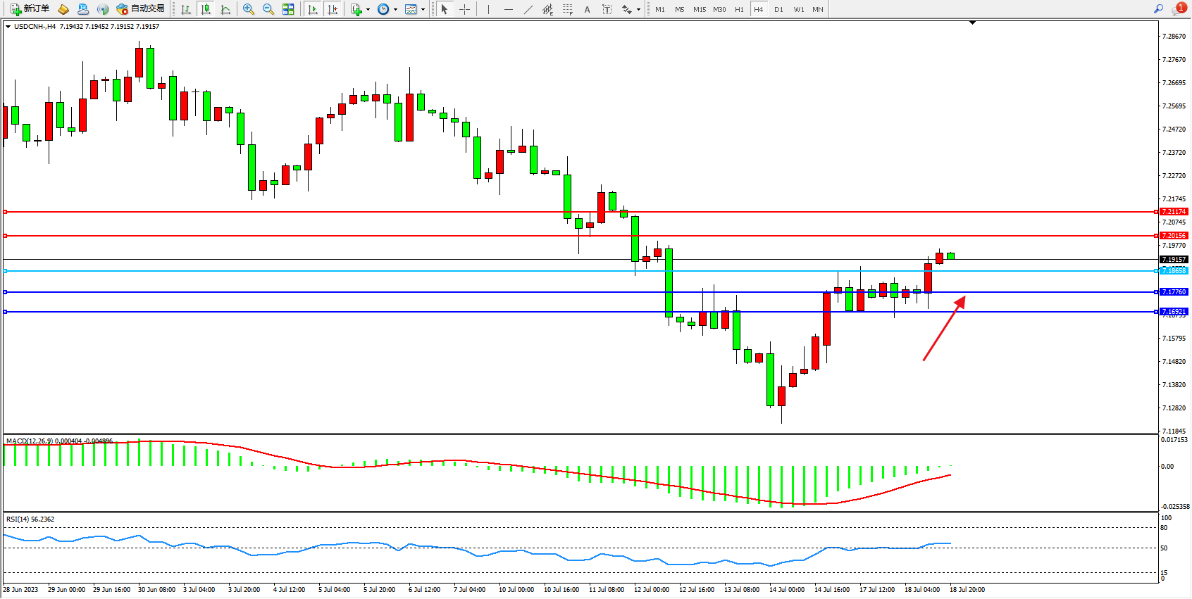 交易策略:7.18658上方看涨,目标7.20156 7.21174