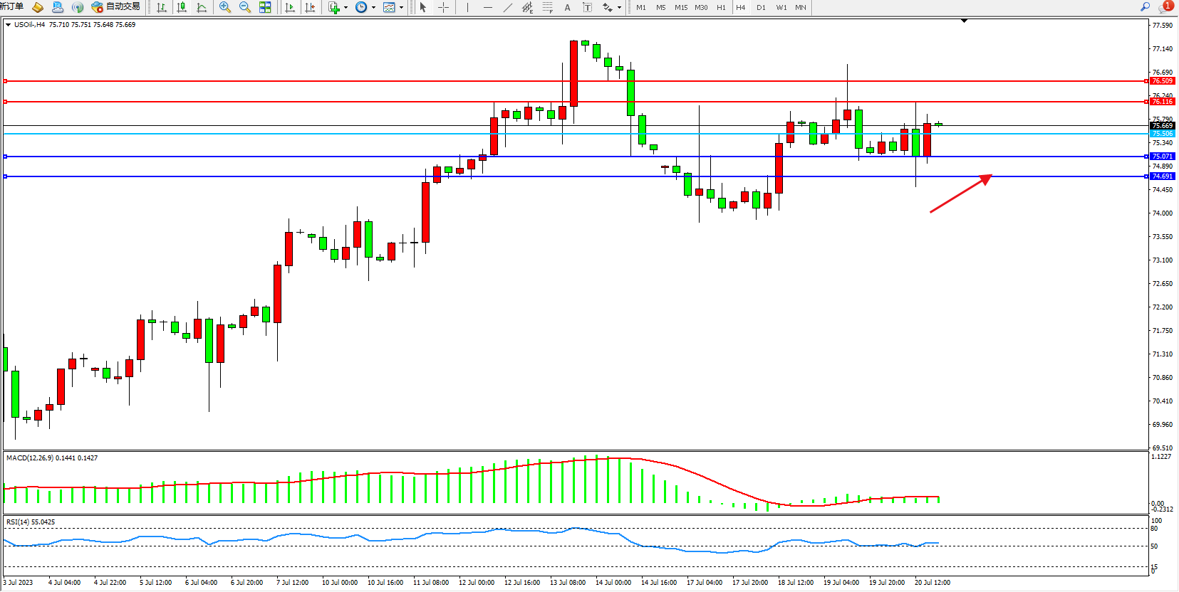 交易策略:75.506上方看涨,目标76.116  76.509