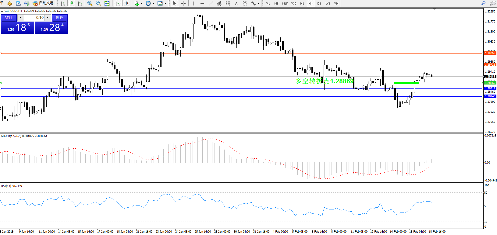 美元指数自高位回落带动英镑兑美元持续反弹,目前交投于1.2930附近,中美贸易谈判乐观预期进一步升温,导致美元持续自上周五(2月15日)录得的年内新高97.38回落,为英镑反弹的主因所在。此外英国内阁大臣戴维·利丁顿上周在布鲁塞尔表示,他的经验是,关于英国脱欧的谈判不只是礼遇,这表明英国政府可能会重新协商脱欧协议,或推迟原定于3月29日的脱欧期限,这一表态也为英镑提供支撑。