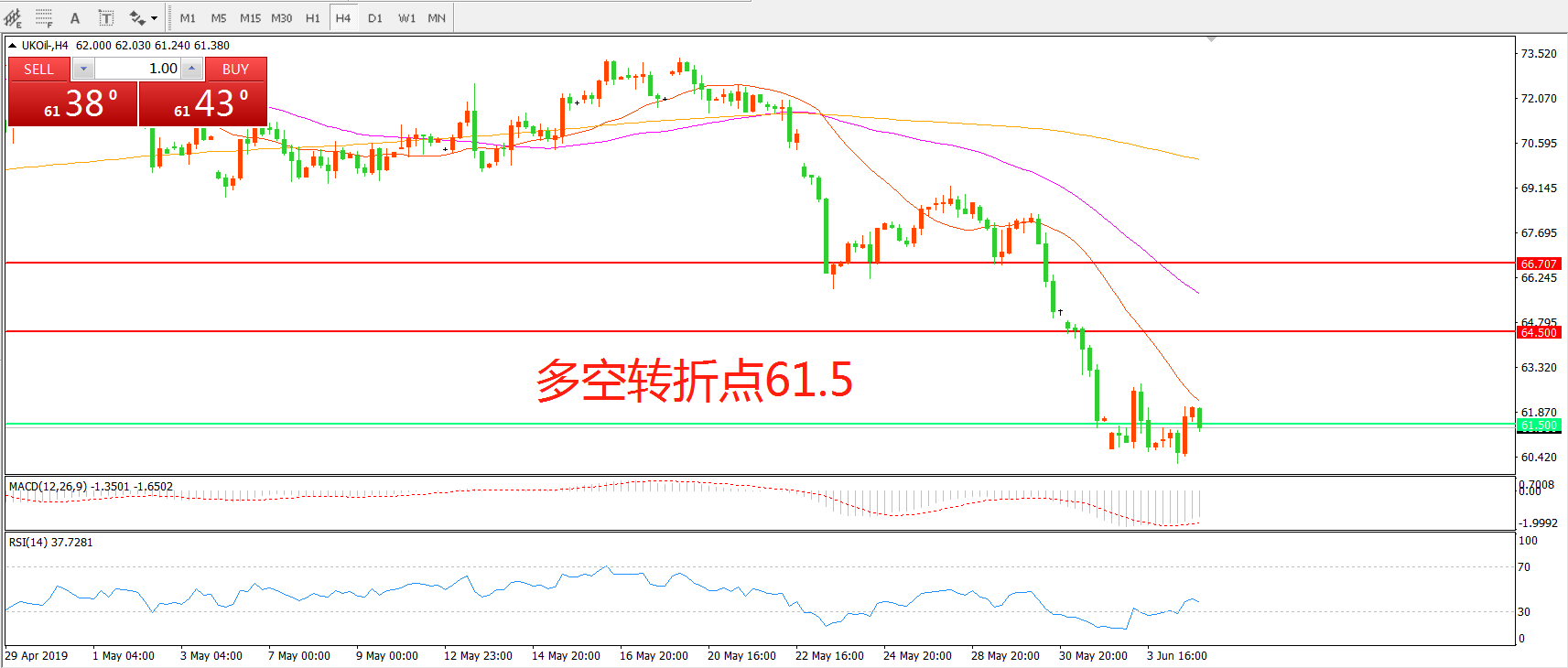 交易策略:在61.50之下看跌,目标57.50     53.00