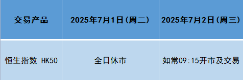 因应2025年7月1日(周二)为香港回归假期,本公司以下产品的交易时间将于假期期间作以下安排,敬请留意。