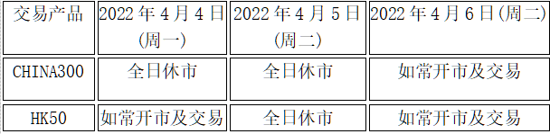 因应2022年4月3日(周日)至4月5日(星期二)为国内清明节假期,本公司以下产品的交易时间将于假期期间作以下安排,敬请留意。
