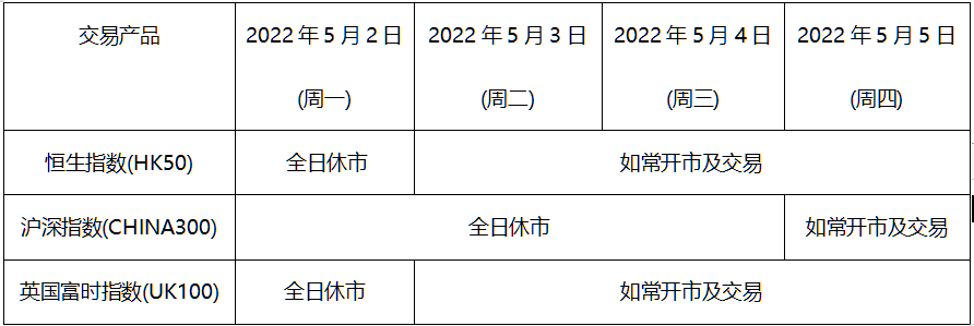 因应2022年5月2日(周一)至2022年5月4日(周三)为中国劳动节假期,5月2日(周一)为英国银行假期关系,本公司以下产品的交易时间将于假期期间作以下安排,敬请留意。