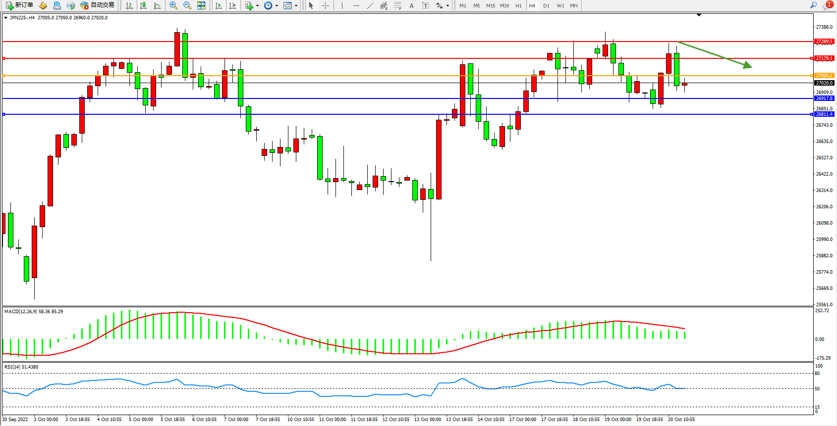 日经225指数10月20日(周四)收盘下跌248.38点,跌幅0.91%,报27009.00点。日本财务省的数据显示,9月份日本进口同比增长45.9%,这是日本进口连续第20个月上涨,总值达到11万亿日元,创历史新高。此前一个月的涨幅为49.9%。