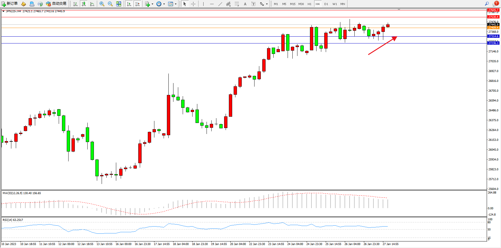 日经指数JPN225——4小时K线图显示: