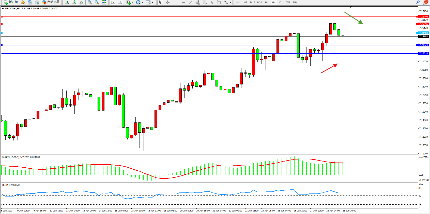 交易策略:7.24488下方看跌,目标7.23024 7.22018