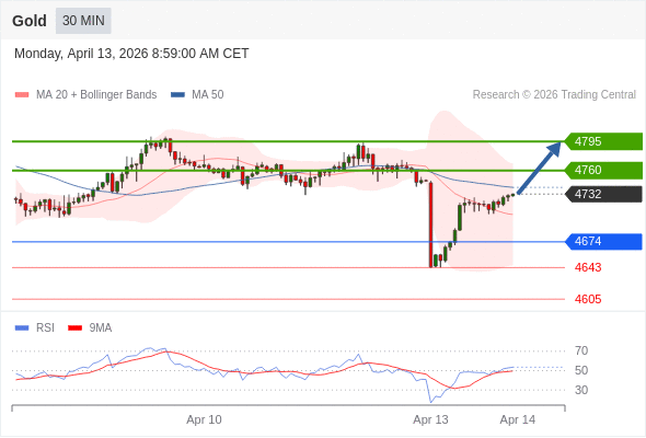 在 4674 之上,看涨,目标价位为 4760 ,然后为 4795 。